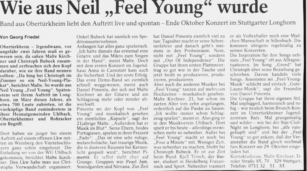 feelyoung wurde 1995 in Stuttgart gegründet – als Hommage an den „Godfather of Grunge“ Neil Young und als Ausdruck eines eigenen Lebensgefühls. Geprägt von Alternative Rock, Grunge, Rock und Punk, vereint die Band rohe Energie mit dreistimmigem Gesang und fettem Gitarrensound.