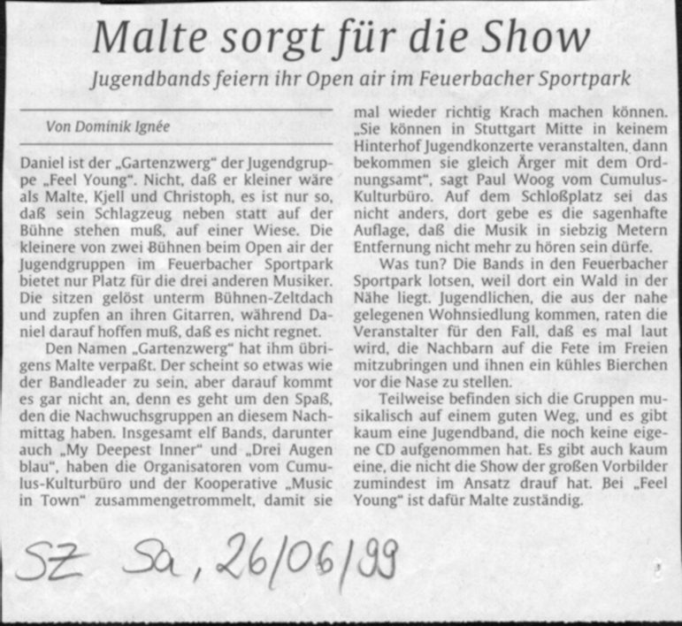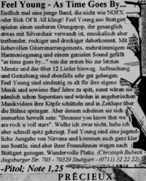 Acht Wochen vor dem Abi. Fostex-Vierspurgerät, Bunker Heslach bei The Zombie Elk Experience… Andi Brenner und André Neves Pimenta von OUT OF INDEPENDENCE nehmen feelyoung unter die Fittiche und ermöglichen der Band die ersten Tonaufnahmen (18. – 22.02.1996).